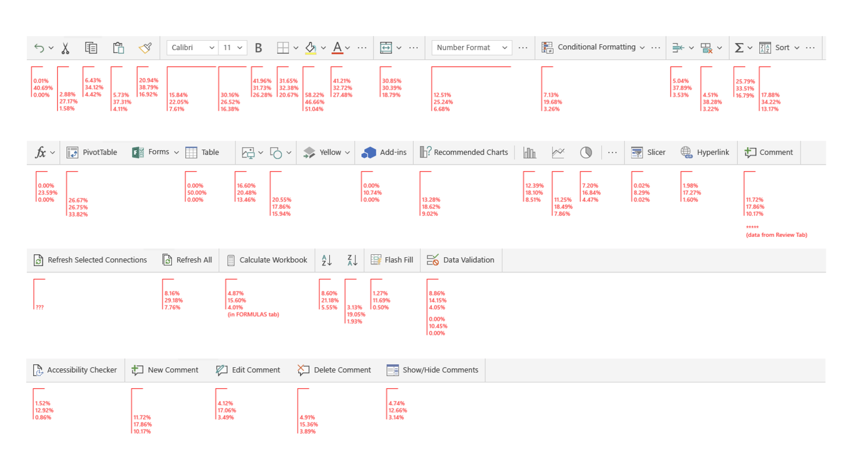 There are ninety three default controls in Word online ribbon, grouped under six regular tabs and two contextual tabs. After re-prioritizing and re-grouping by studying the ribbon telemetry and talk to users, we minimized the default first level controls to seventy four and updated the multi-line ribbon into a single-line version.